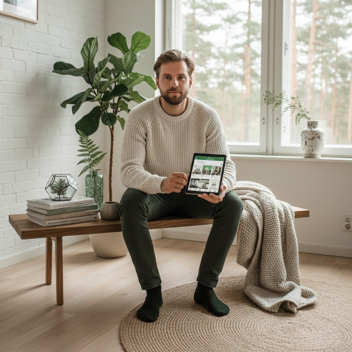 核心定位为 Slow Living, Conscious Choices(慢生活,有意识的选择)——斯德哥尔摩真实公寓,自然光线,冷白色调,无过度滤镜。以”北欧男性视角的可持续家居”为叙事核心,将环保理念与极简美学自然融合,而非说教式输出。英语主力内容覆盖全球英语系北欧爱好者,瑞典语内容深耕本土受众,是北欧环保家居品类 Pinterest 平台认知度最高的男性达人。